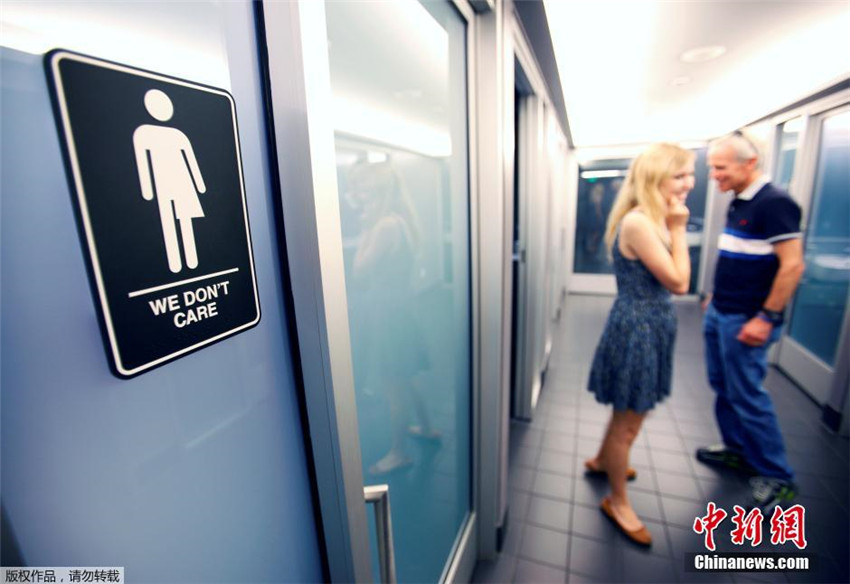 米國ノースカロライナ州ダーナムにある21C博物館內(nèi)にあるホテルで現(xiàn)地時間5月3日、館內(nèi)のトイレに各ジェンダー(性別)の人の使用を許可するプレートが設置された。ペレグニン?ホニック氏というアーティストによってデザインされたこの標示は、このほど米國ノースカロライナ州で通過した「トイレ法」への抗議を示している。中國新聞網(wǎng)が伝えた。