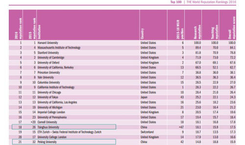 トップ100校に入ったのは、清華大學(xué)?北京大學(xué)?復(fù)旦大學(xué)?上海交通大學(xué)?浙江大學(xué)の5校。このうち清華大學(xué)は第18位、北京大學(xué)は第21位と、中國(guó)の大學(xué)で初めて上位20校ラインに近づいた。復(fù)旦大學(xué)と上海交通大學(xué)は第71位から第80位のグループ、浙江大學(xué)は第81位から第90位のグループに、それぞれランクインした。