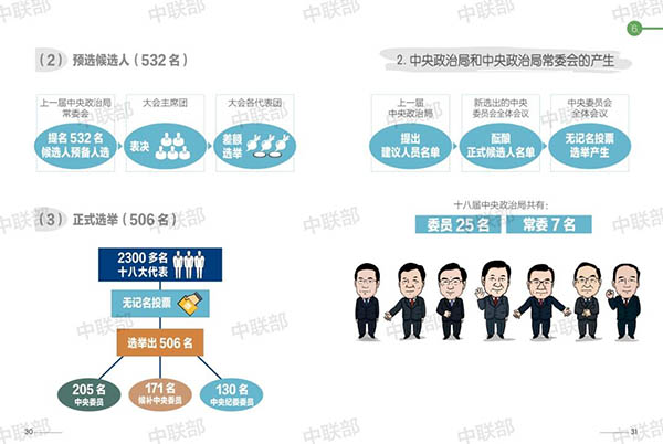 図解では20のイラストを用いて、「指導(dǎo)者の構(gòu)成」、「どうやって選抜?採用されるのか?」、「どのように監(jiān)督するのか?」、「審査?評価方法」、「フレキシブルな人材活用」、「最高指導(dǎo)者と指導(dǎo)機関の誕生」という6つの面から中國共産黨がいかにして黨?政府指導(dǎo)者を選抜?採用するかについてわかりやすく紹介している。どれも明るいタッチの、ユーモアあふれるイラストだ。