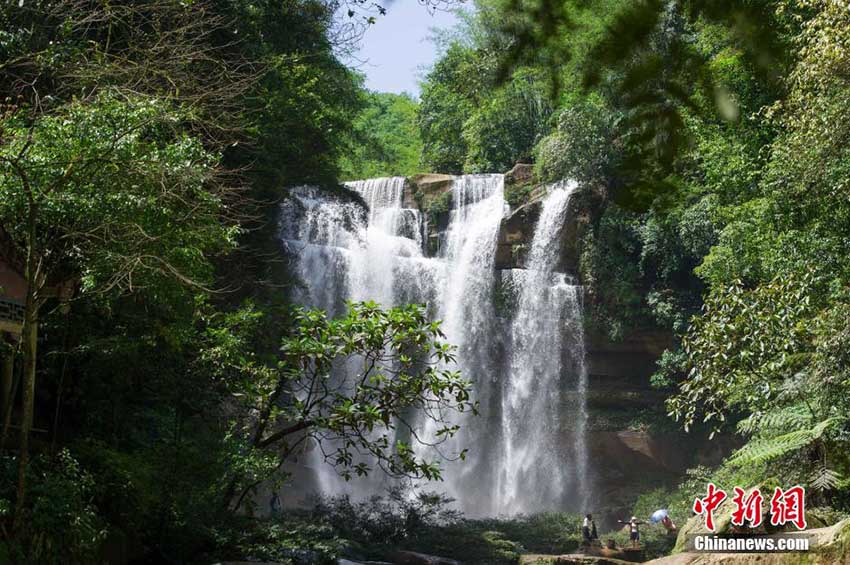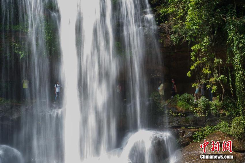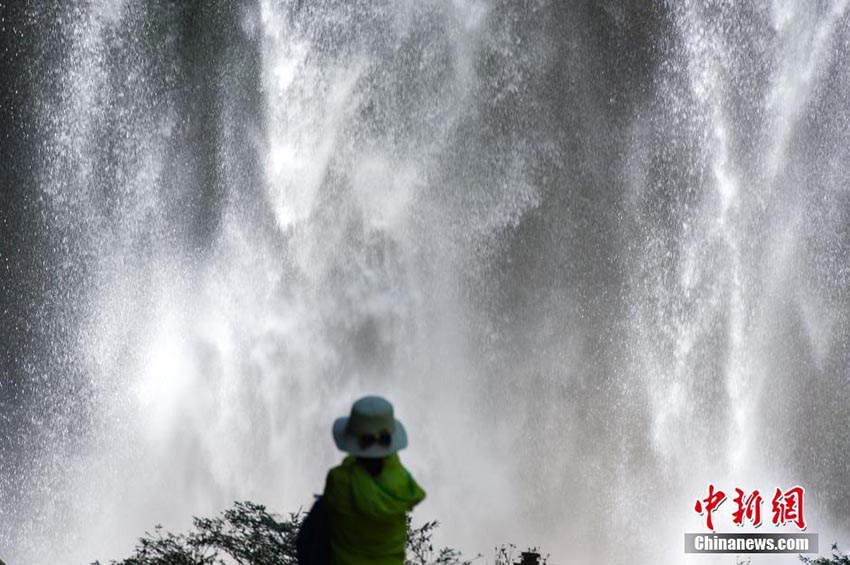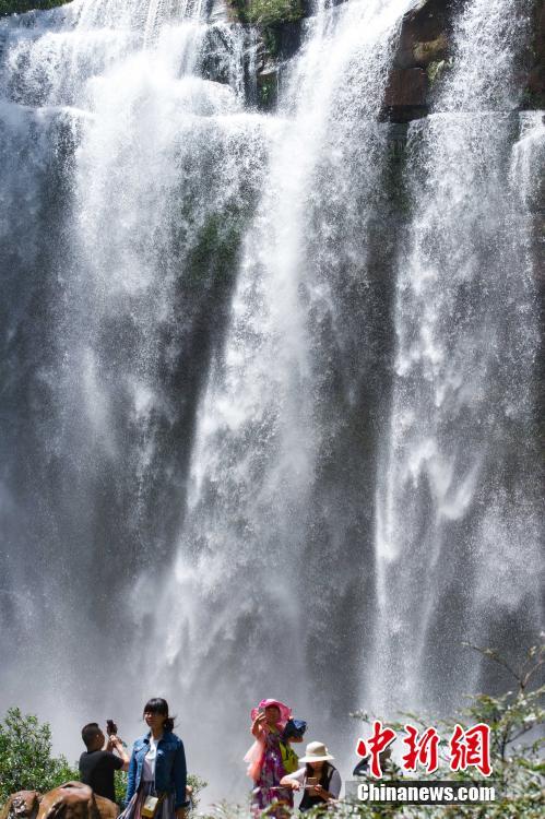 観光客が5月10日、四洞溝瀑布群を見學(xué)している。同日、第11回貴州省観光産業(yè)発展大會が同省仁懷市で開幕した。今大會サブ會場の1つ赤水市は降ったばかりの豪雨により、四洞溝景勝地の複數(shù)の瀑布は水量が増え、壯大な景色が観光ピークの到來を告げていた。中國新聞網(wǎng)が伝えた。(編集JK)