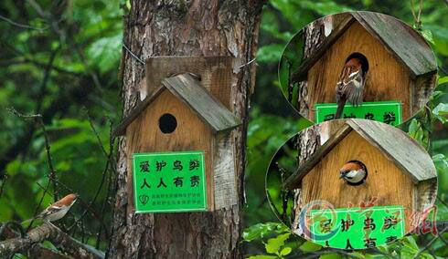 17日、雨が降りしきる襄陽市の昌集村では、1羽のニュウナイスズメがしばらく周囲をうかがった後で、ボランティアが野鳥のために作った巣箱に入っていった。野鳥の繁殖を促すため、襄陽市野生鳥類保護(hù)協(xié)會のボランティアたちは市全體に手分けして巣箱を設(shè)置し、効果をあげている。(編集TG)