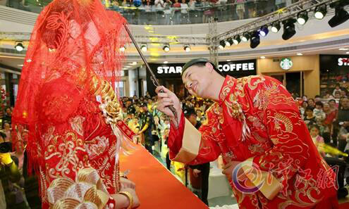 4月17日、一人の新郎が秤の棒で新婦の頭を覆う赤い布を持ち上げていた。この日、襄陽萬達(dá)広場のアクセサリーショップ?戴福來珠寶金行で中國風(fēng)婚禮ショーが開かれていた。新郎新婦は中國風(fēng)の婚禮服に身を包み、中國の伝統(tǒng)的な婚禮の儀式を披露し、伝統(tǒng)的な婚禮の文化を紹介した。(編集TG)
