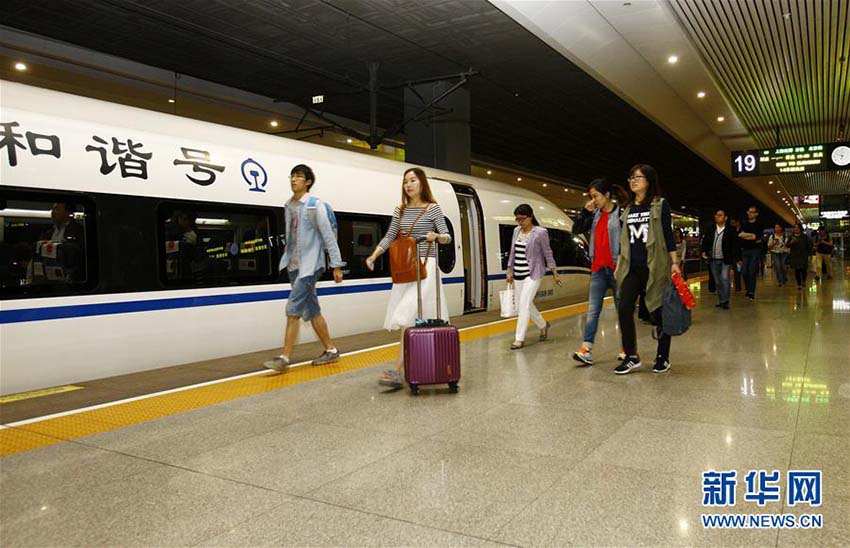 旅行客が5月15日、改札口を通り高速列車に乗り込んでいる。同日深夜0時から全國の鉄道で新たな列車運行ダイヤが施行された。上海の虹橋駅は夜間の列車を増発、そのうち上海鉄道局運輸區(qū)が同日増発させた夜間列車の始発便はG8號上海ー北京高速列車で、この列車の乗車率は100%に達した。新華社が伝えた。(編集JK)