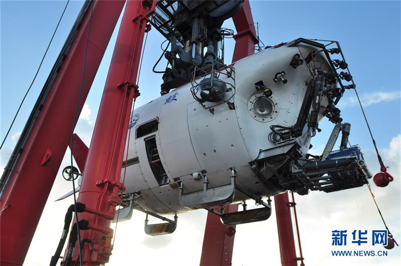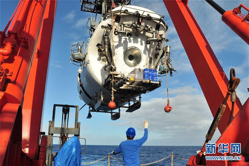 有人潛水艇「蛟竜號」は15日、北西太平洋ヤップ海溝西側で、科學的応用潛水に成功した。蛟竜號がヤップ海溝で潛水作業(yè)を実施するのは今回が初。最大潛水深度は4955メートル。寫真は有人潛水艇「蛟竜號」を投下する水上サポートシステムの作業(yè)員。人民日報が伝えた。(編集YF)