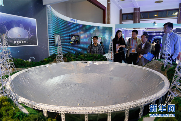中國(guó)科學(xué)院國(guó)家天文臺(tái)が提供する口徑500メートル球面電波望遠(yuǎn)鏡(FAST)の模型が、來(lái)場(chǎng)者の注目を集めた。この模型は同プロジェクト竣工後の狀態(tài)を示している。來(lái)場(chǎng)者はこの世界最大口徑電波望遠(yuǎn)鏡の構(gòu)造を、近距離で観察することができる。
