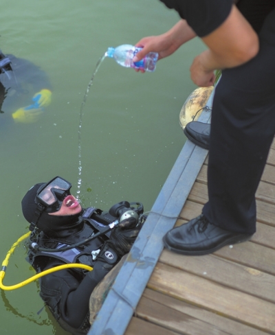 午後の訓(xùn)練を終えくたくたになった潛水士