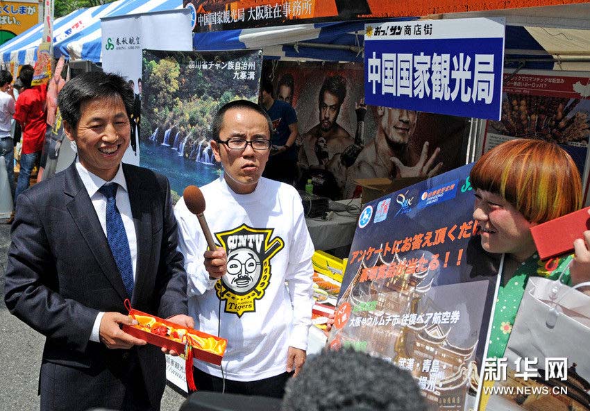 中國國家観光局大阪駐在事務所は、山東航空や春秋航空と共同で、今回の神戸まつりに出展。ブースには萬里の長城や九寨溝などの寫真が高い位置に掲げられ中國の魅力が伝えられた。同事務所の責任者?劉海生氏は、サンテレビの生放送番組の取材を受け、中國の美しい景色やシルクロードにある世界文化遺産を紹介。日本の視聴者に対して、中國へ行って中國の文化、歴史を體験するようアピールした。