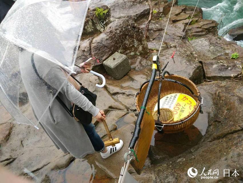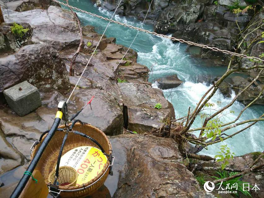 また渓谷の周りには団子を売る店が多く軒を並べていた。厳美渓はその絶景だけでなく、一風(fēng)変わったこの団子も非常に有名で、1878年創(chuàng)業(yè)の郭公屋の郭公だんごは厳美渓の名物だ。観光客が団子を買う場合は、休憩所にある移動式の竹籠に必要分の金額のお金を入れ、備え付けの木槌で板を叩くと、対岸のお店から団子が熱々のお茶と共に竹籠に入れられワイヤーロープ伝いに屆けられてくる。この獨特な販売方法は観光客の興味をひき、體験する人が引きも切らない。美食と絶景のコラボに長旅の疲れも一気に吹き飛び、厳美渓視察の旅を満足して終えることができた。