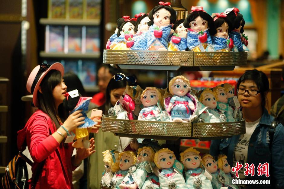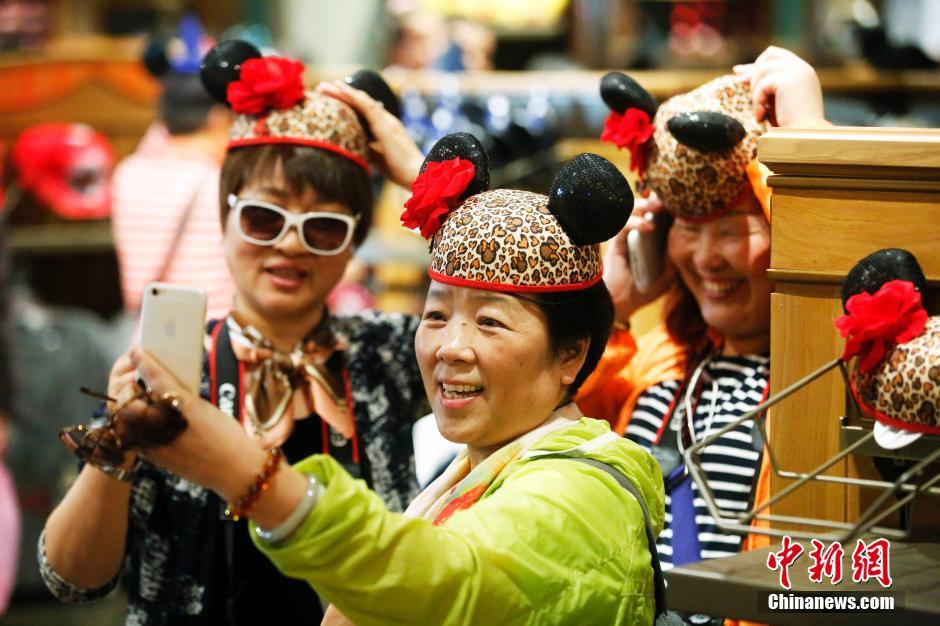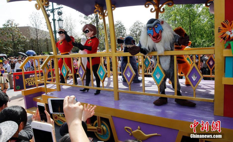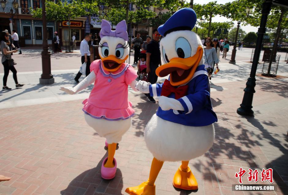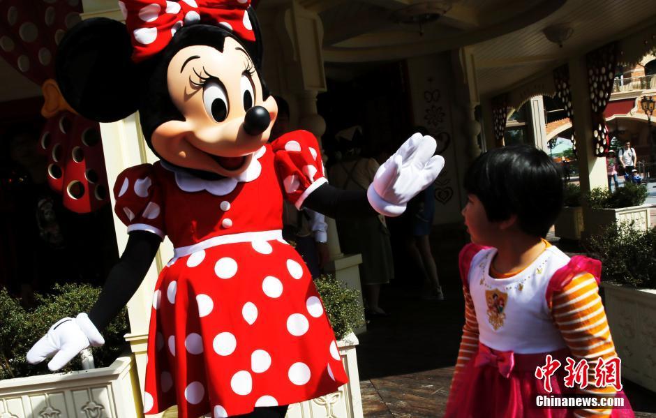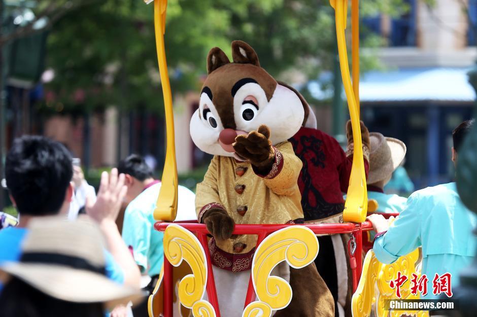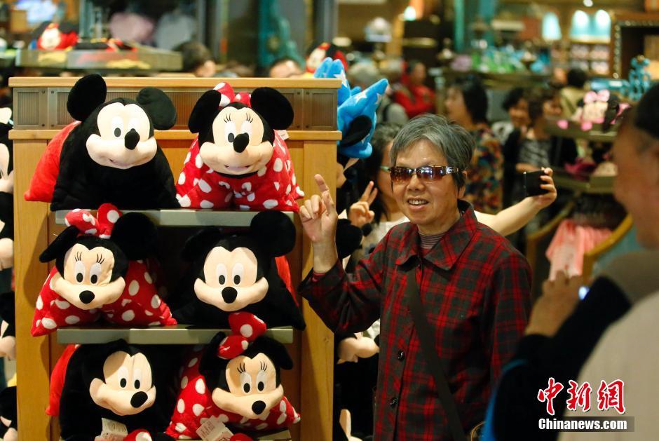 上海ディズニーのプレオープン、キャラクターと觸れ合う観光客