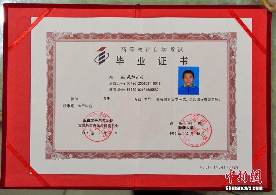 小學(xué)校4年生の時(shí)に學(xué)校を中退した呉加百利さんは家で暇を持て余し、アニメを見ている時(shí)に日本語を?qū)Wんだ。彼はこれをきっかけに勉強(qiáng)の面白さを見出し、獨(dú)學(xué)の勉強(qiáng)法を編み出した。2015年末、呉加百利さんは英語専攻3年制高等教育獨(dú)學(xué)試験の全カリキュラムを終え、卒業(yè)証書を取得した。現(xiàn)在、英語専攻の4年制獨(dú)學(xué)試験カリキュラムを?qū)Wんでいる彼は大半の科目は既に終了し論文審査の準(zhǔn)備をしている最中だ。また獨(dú)學(xué)試験の法學(xué)専攻、日本語専攻の4年制カリキュラムに出願(yuàn)した。中國新聞網(wǎng)が伝えた。(編集JK)