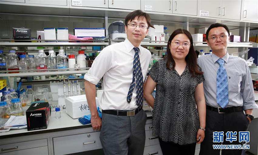 同研究所のサンプル作成実験室內(nèi)で20日、柳氏、李氏、章氏(左から右)がタンパク質(zhì)超複合體のサンプルを手に記念撮影をした。このタンパク質(zhì)超複合體に含まれる葉緑素が大半の赤外線と紫外線を吸収し緑光を吸収しないため、実験室內(nèi)の照明をすべて緑色の光源にすることでサンプルを保護(hù)している。(編集YF)