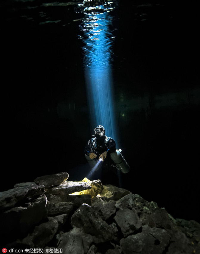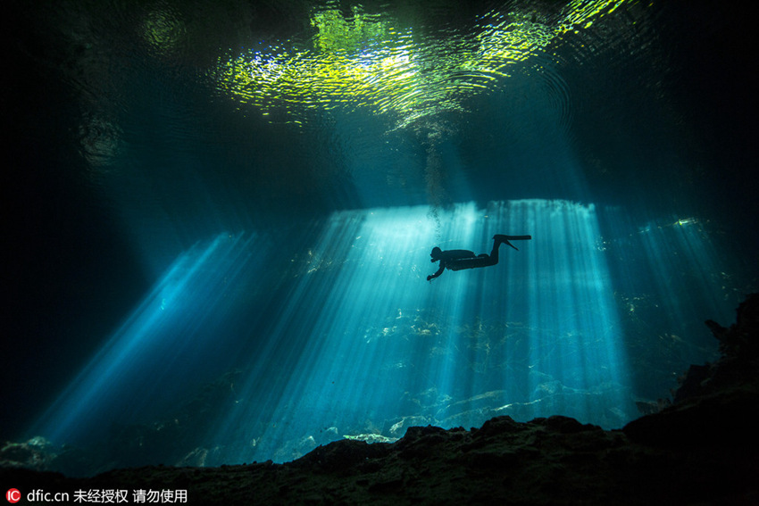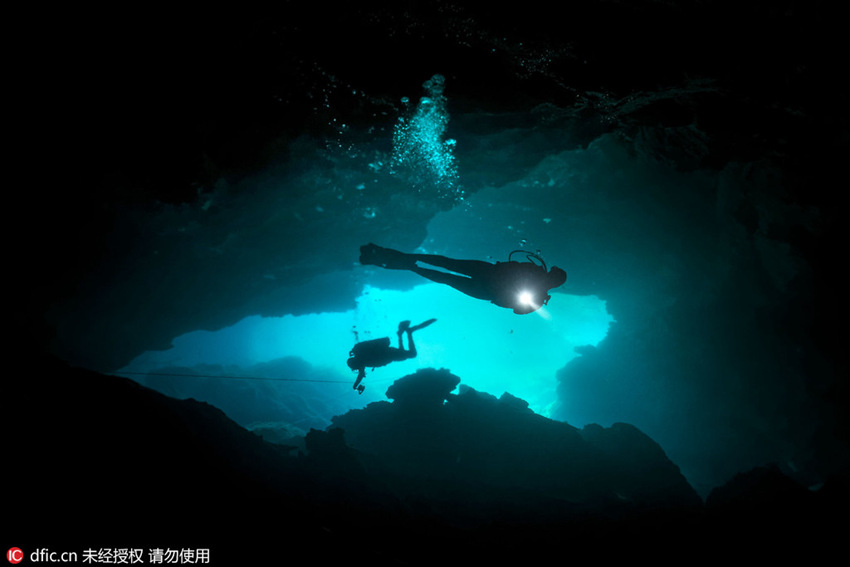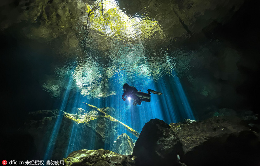 実際には、これはファンタジックな場所ではなく、ユカタン半島の森林に水沒した神秘的な洞窟で、マヤ文明の時期作られた墓地、不気味な場所だ。白く見えるのは骨や化石で、洞窟全體に不気味な雰囲気が漂っている。撮影したのはフランスの水中カメラマン?ファブリース?グエランさんだ。(編集KN)