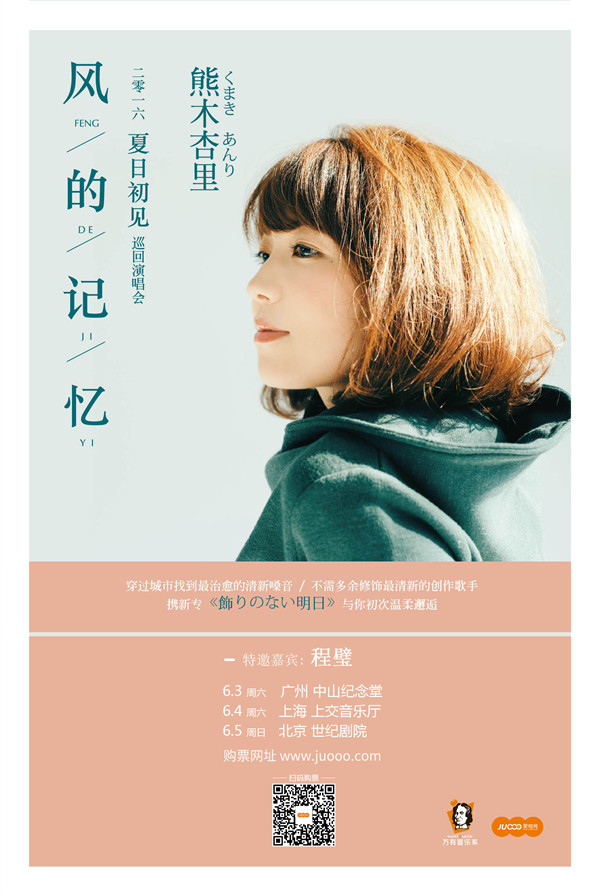 日本の癒し系シンガーソングライター熊木杏里の中國(guó)公演「風(fēng)の記憶」が、6月3日から、広州、上海、北京で開催される。熊木が中國(guó)で正式公演を行うのはこれが初めてであるものの、その透き通る、素樸な獨(dú)特の歌聲やさわやかでやさしい曲風(fēng)を武器に、中國(guó)でも既に多くのファンを獲得している。中國(guó)のファンからは親しみを込めて「小熊」と呼ばれている。中國(guó)での3公演には、中國(guó)で活躍しているシンガーソングライターの程壁(チェン?ビー)もゲストとして登場(chǎng)し、新曲「向著明亮那方」を披露する。新快報(bào)が伝えた。