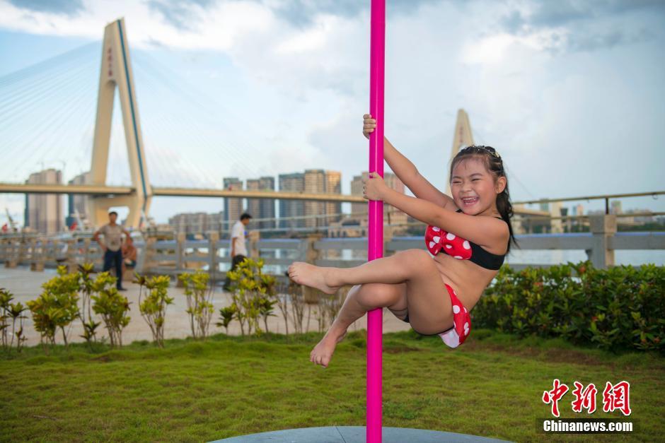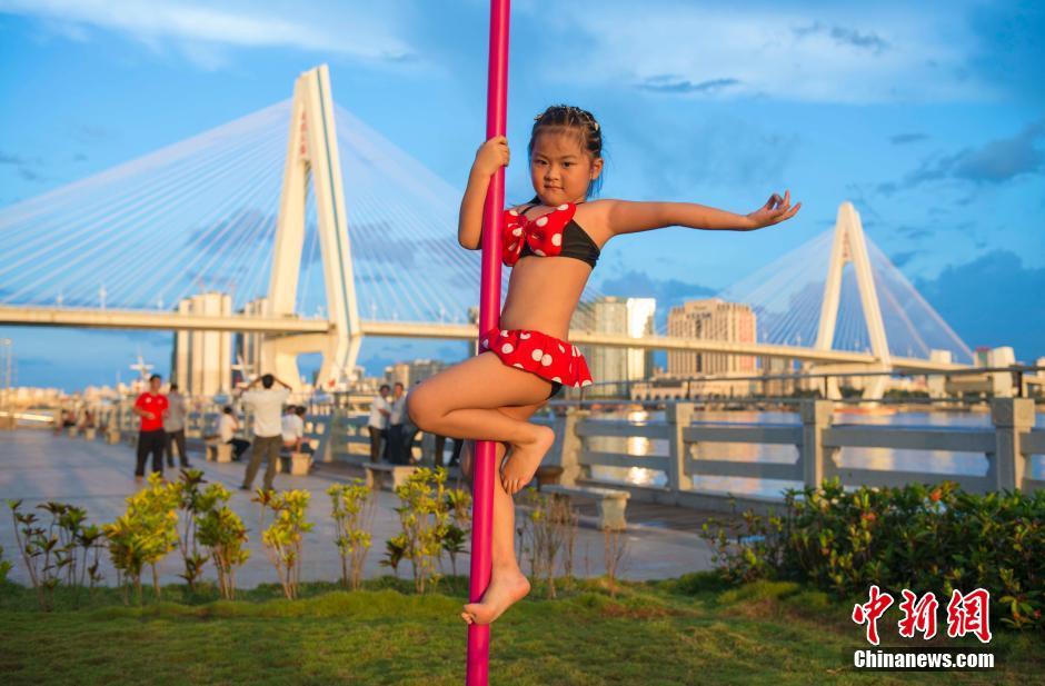 「國(guó)際子供の日(6月1日)」前夜の5月31日、海南省海口市では5歳になる女の子?陳洛ジェン(ジェンは至に秦)ちゃんとその母親が他の數(shù)名のポールダンス愛(ài)好者と共に、??谑兰o(jì)大橋の近くでポールダンスショーを演じていた。陳ちゃんはポールダンスを?qū)Wび始めてまだ半年にもならないが、難易度の高い動(dòng)作のほとんどが様になってきている。ポールにつかまって回転し踴る様子に、多くの人が興味深げに感心しながらて眺めていた。中國(guó)新聞網(wǎng)が伝えた。寫(xiě)真は夕焼けをバックに難易度の高い動(dòng)作を披露する陳ちゃん。(編集TG)