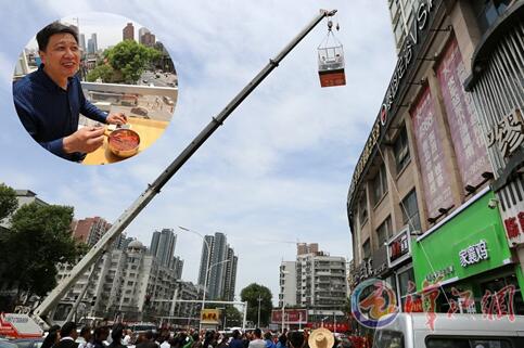 湖北省襄陽市樊城人民路にあるラーメン屋が5月15日、上空に「空中席」を特別に設置、最初の客らに褒美を與えた。彼らはクレーンに乗り上空30メートルまで引き上げられ、特徴的な麺を無料で味わった。(編集JK)