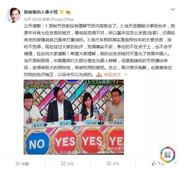 この番組にゲストの1人として招かれた日本籍華人の李小牧氏は番組放送後、ウェイボーで謝罪し、當(dāng)日その場で臺本を與えられたことを明かし、自身の発言は主に臺本の筋書きに沿うものだったとした。ネットユーザーの批判を受け、彼自身も不適切だったことを認め、「議論の論點はズレており、ものごとの筋道に外れた內(nèi)容だった。利用されたように感じた」とした。