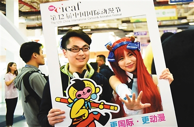 第12回中國國際アニメ祭で記念寫真を撮る?yún)⒓诱撸?月27日撮影)。