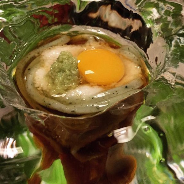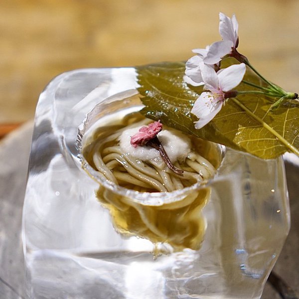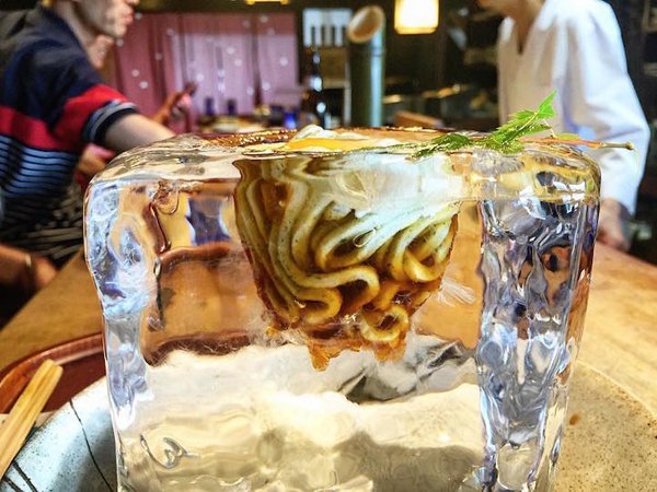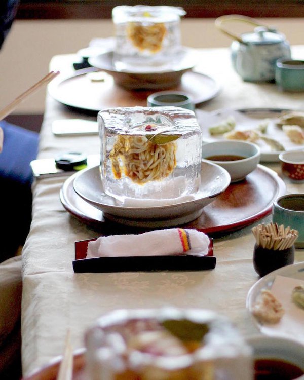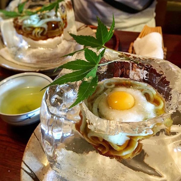 京都にある「天ぷら?松」という店ではうどんを氷の器に入れ、ヨモギ、わさび、生卵の黃身を盛り付けている?!笟辘纹鳌工贤该鳏胜韦恰ⅴ鹰弗濂ⅴ氲膜舜螭圣ぅ螗靴趣ⅳ?。(編集JK)