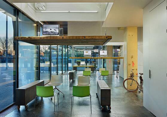 椅子や事務所內のその他の設備が片付けられると、ここは完全に開放的な空間になる。週末はダンス、ヨガ、その他の思いつく限りの活動に利用できる。