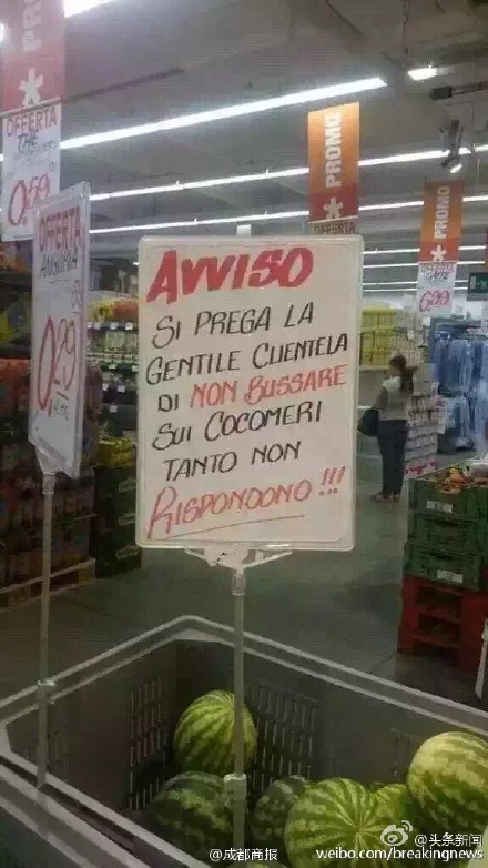 1萬人以上を巻き込んだこの論爭は、微博(ウェイボー)に最近、イタリアのあるスーパーのスイカ売り場に掲げられた「スイカをたたかないでください。なんの反応もありませんから」との注意書きの畫像が投稿されたことがきっかけだった。この注意書きはイタリア語で書かれており、中國人の客を?qū)澫螭藪鳏菠椁欷郡猡韦扦悉胜丹饯Δ坤?、中國の一部のネットユーザーが「中國のスイカを選ぶ時の慣習(xí)に対する挑戦」と見なした。そして、ネットユーザーからは、すぐに「スイカをたたくというのは世界的な方法」との聲が上がった。ネット上で検索してみると、スイカをたたいた時の音で熟れているかを判斷するというのは、世界共通であることが分かり、どのようにスイカを選ぶかに関する各種動畫やブログを見付けることができる?!弗攻ぅ?たたく」ことを特集した、舊ソ連時代の有名な動畫も存在するという。