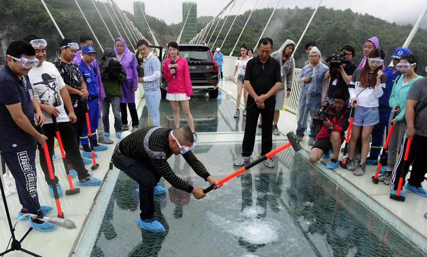 30人あまりがハンマーで代わる代わるガラス床を叩いた。