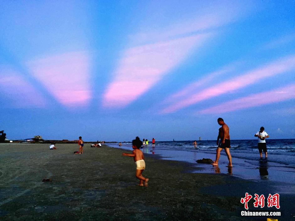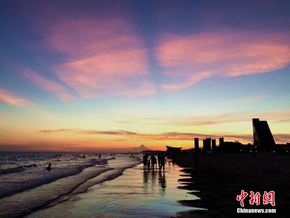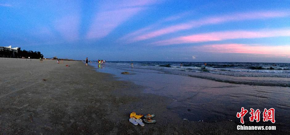 広西チワン族自治區(qū)北海市の僑港ビーチに27日、夕焼けの珍しい景色が広がった。熱帯高気圧の影響を受け、同自治區(qū)は連日熱暑が続いたが、その熱で格段と美しい風(fēng)景が広がり、夕涼みにビーチに出かけた多くの市民や観光客が魅了された。同自治區(qū)気象臺(tái)の予報(bào)によると、今後數(shù)日は暑さが続き、28日にはここ數(shù)日で最も気溫が高い時(shí)期に突入する見込みだ。中國(guó)新聞網(wǎng)が伝えた。(編集JK)