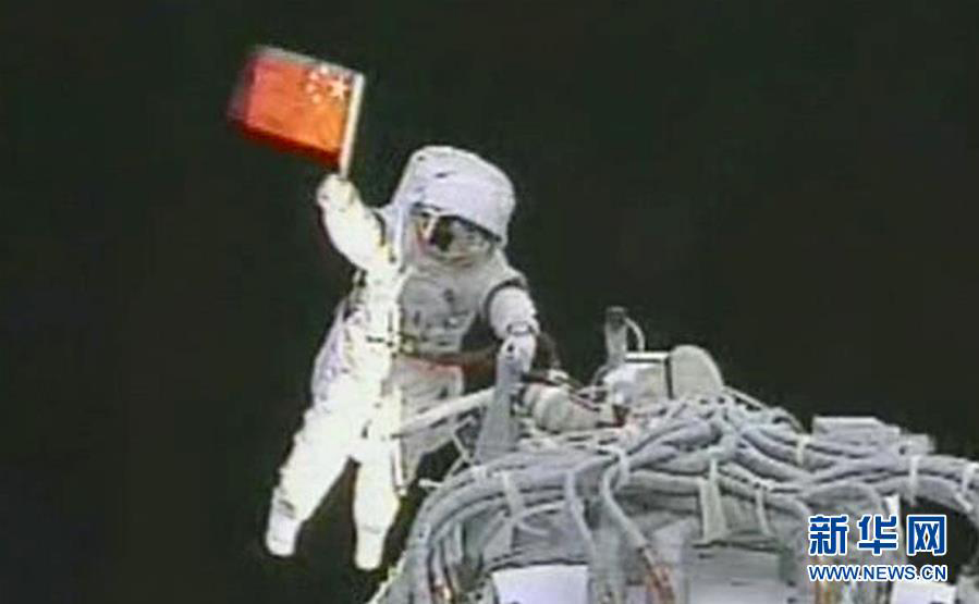 2008年9月27日、有人宇宙船「神舟7號」の船外調(diào)査任務(wù)を遂行する宇宙飛行士の■志剛氏(■は曜のつくり)が船外に出たところで中國の國旗を振る様子。
