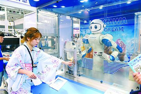 世界最大のロボットメーカーの一つである安川電機(jī)は、10數(shù)臺(tái)の製品を持ち込んだ。「獅子舞を踴る」産業(yè)用大型ロボットの隣で、來場(chǎng)者は特殊なアイスクリームを待っていた。これはロボットが作るアイスのことだ。アイスを作る際に、コーンを握る「ロボットアーム」は回転しながら下がり、高精度制御能力を示した。