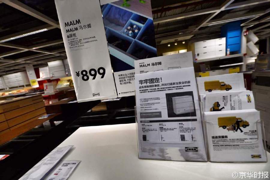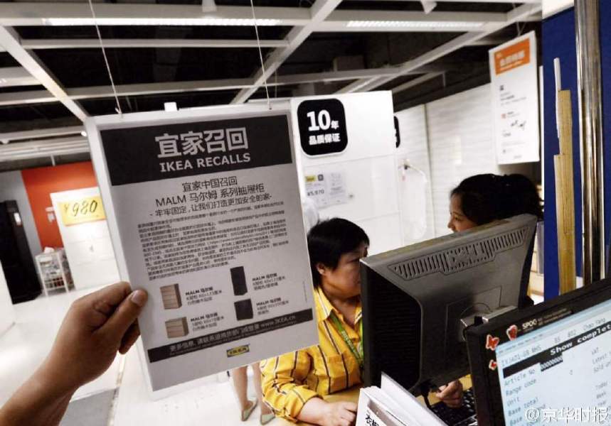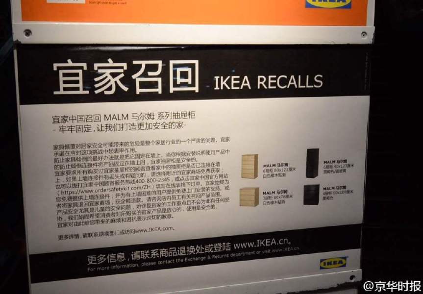 中國國家質(zhì)量監(jiān)督検験検疫総局(AQSIQ)の行政指導(dǎo)後、IKEA(イケア)中國は13日に死亡事故が発生している同社の「マルムシリーズのタンス」をリコールする姿勢をようやく示した。しかし大変興味深いのはリコール通知を店內(nèi)に掲示しているものの、同型のマルムシリーズのタンスが通常通り販売されているのを本日、IKEA四元橋店で発見した。IKEA(イケア)側(cè)に質(zhì)問を行なったが、同社からの返答は未だなされていない。京華時(shí)報(bào)が伝えた。(編集JK)