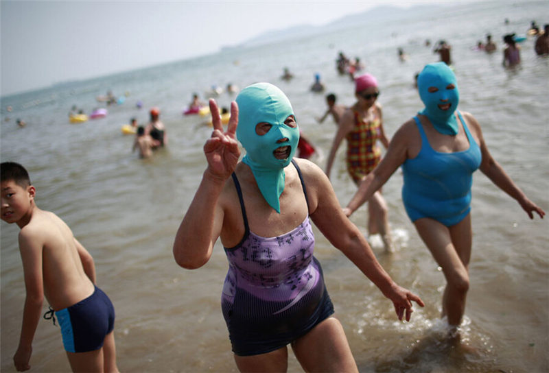 2012年7月6日、ナイロン製のマスクを著用した女性が山東省青島市の浜辺に座る様子。炎天下が続き、ナイロン製の日焼け防止マスク「顔キニ(フェイスキニ)」が飛ぶように売れ、多くの女性の夏の日焼け対策グッズになった。