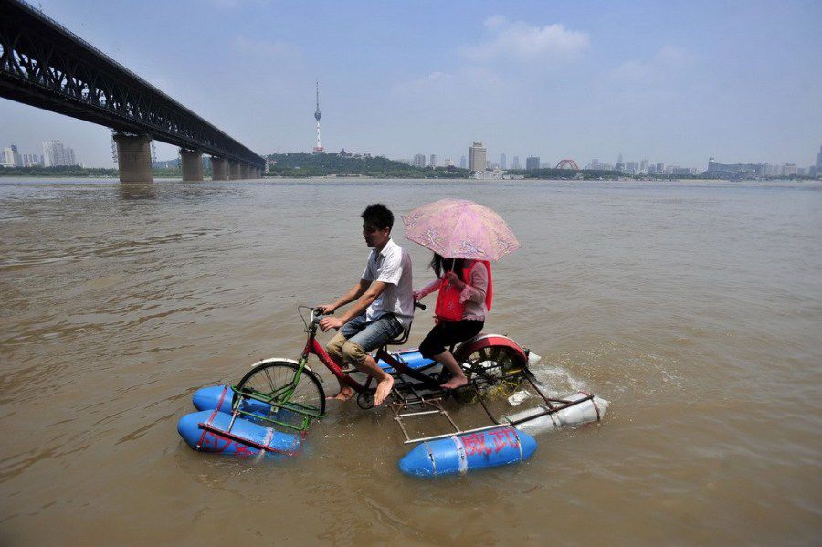 2011年6月29日、武漢市の李衛(wèi)國(guó)さんの生徒がガールフレンドと長(zhǎng)江の湖面で「サイクリング」した。これは李さんが作った「水陸両用二人乗り自転車」だ。