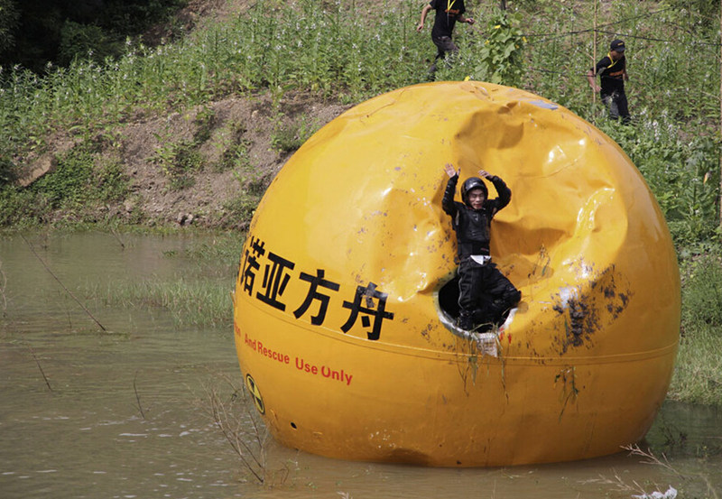 2012年8月6日、自ら製造した「ノアの方舟」に乗る浙江省義烏市の商人の楊宗福さん。この裝置は直徑4メートルで、外層は耐震設(shè)計(jì)。內(nèi)裝の材料は放射線を遮斷できる。楊さんによると、この裝置は1700度の高溫と350トンの衝撃力に耐えられ、中にはテレビや冷蔵庫、Wi-Fiなどが設(shè)置されているという。
