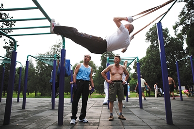何人かの60代のおじいさんたちは、小麥色の肌と鍛えられた筋肉を露わにしている。誰かが平行棒の上で左右開腳をしたかと思うと、別の男性は鉄棒で大車輪をしたり、さかさまにぶら下がった狀態(tài)で人を抱えあげたり、うんていをしたり、燕が飛ぶ姿を真似て體を反り上げたりと、次々に得意技を披露していた。
