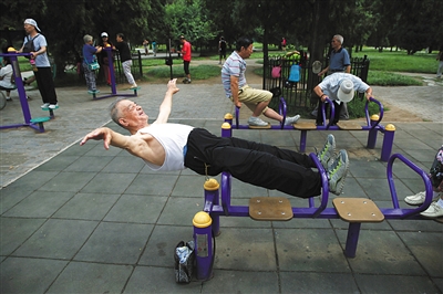 天壇公園にある健康遊具を使って様々なスタイルで腹筋を鍛える男性。