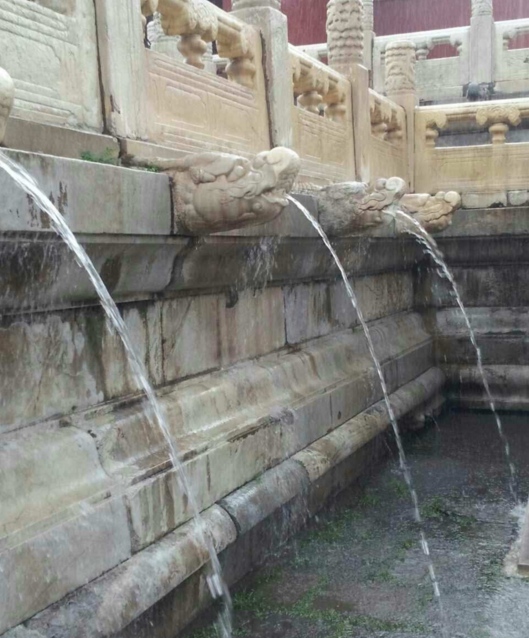 前三殿を例にみてみると、太和殿?中和殿?保和殿は3層の土臺の上にあり、その周囲の欄干の底部には雨水を排出する穴がある。欄干の柱の下には精巧な石作りの竜頭があり、その口の中に掘られた穴も排水口となっている。雨水が下層へと流れていき、石臺の地面に水がたまることはない。