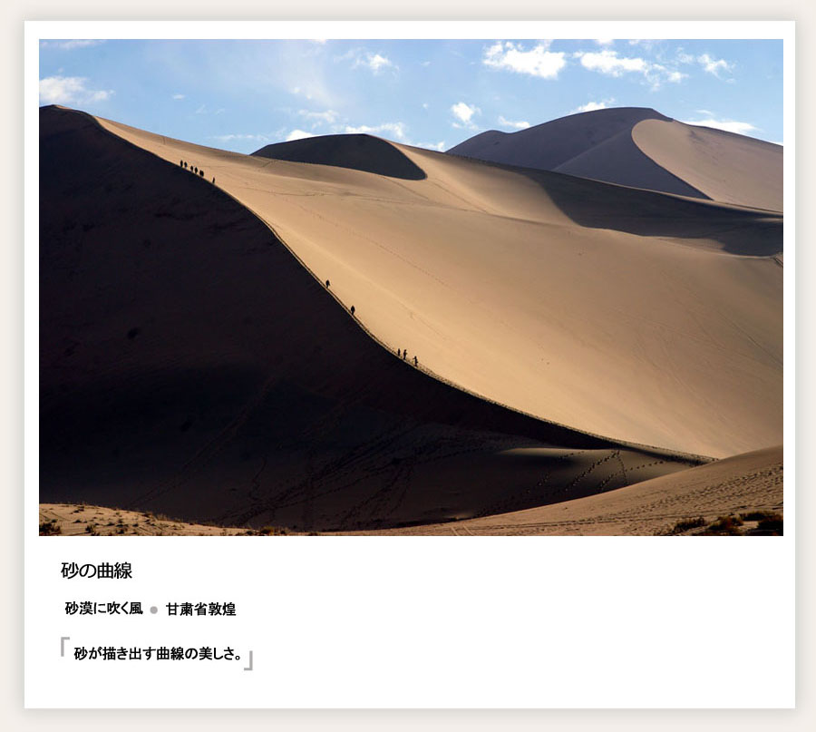 撮影者は、強(qiáng)い明暗の対比と曲線の構(gòu)図のインパクトを利用し、タイトルである「砂の曲線」を表現(xiàn)している。立體感が強(qiáng)く、広大な砂漠を毅然としてまっすぐ歩く小さな小さな數(shù)人の人の影が映り、その大自然と人のはっきりした対比は、最後までやり遂げることこそが勝利のプラスのエネルギーという精神を伝えている。