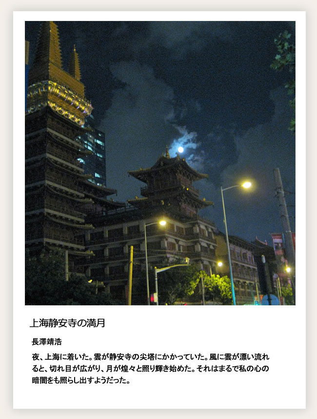 昔、遣唐使として唐で過ごし、その地で沒した安倍仲麿も「天の原 ふりさけ見れば 春日なる 三笠の山に 出でし月かも」(天を仰いではるか遠くを眺めれば、月が昇っている。あの月は、奈良の春日にある、三笠山に昇っていたのと同じ月なのだなあ)と和歌に詠みました。現在でも、中國で月を眺めると、今、日本に昇っている月と同じなのだなあという感慨にふけってしまう気持ちは、よくわかります。コメントの文章とも相俟って、「心に映る中國」というコンテストにぴったりの、美しい寫真だと感じました。