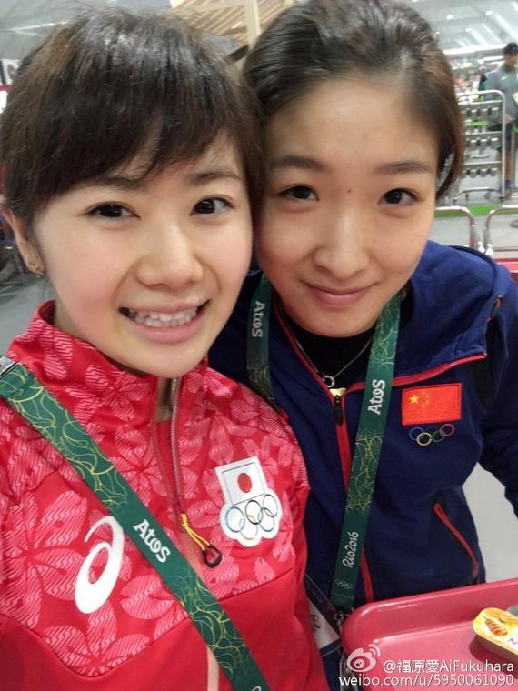リオデジャネイロ五輪に出場する卓球日本代表が7月30日に現(xiàn)地入りし、福原愛選手も練習(xí)を始めている。福原選手はこのほど、中國代表の女子主將?劉詩■選手(■は雨かんむりに文)と仲良く寫ったツーショット寫真を微博(ウェイボー)にアップした。