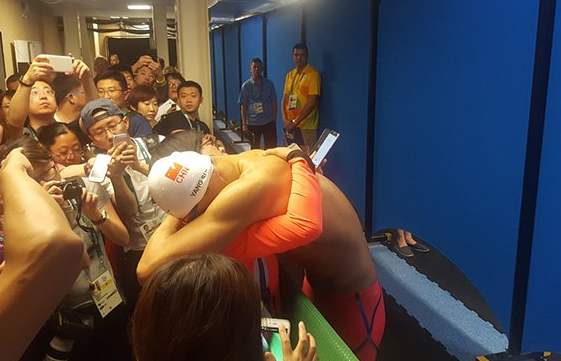 試合後に女性記者を抱きしめながら涙を流す孫楊。