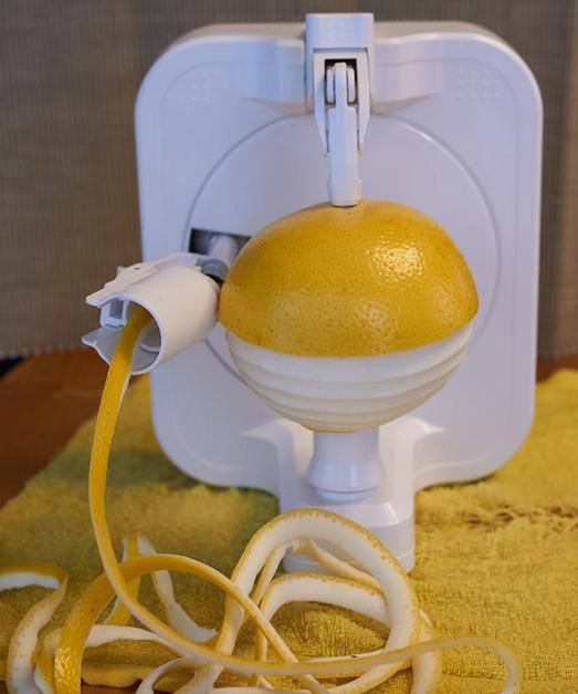 <回転式ピーラー> これに果物を固定してハンドルを回せば、くるくると皮をむいてくれ、そのまま手軽に果物が食べられる。