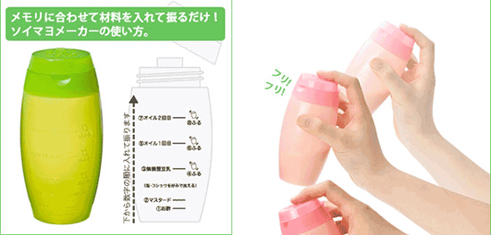 <ソイマヨメーカー> 瓶に書かれた手順通りに豆乳、酢、バター、油を入れて混ぜると、體に優(yōu)しい豆乳のマヨネーズが作れる。
