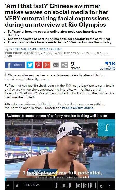 「デイリーメール」は、「傅選手は、今回のインタビューで人気が急上昇し、その大げさな表情を多くの人がスクリーンショットして保存している。わずか2日間で、傅選手の微博(ウェイボー)のフォロワーは5萬6000人から300萬人に激増した。傅選手は中國のソーシャルメディアで旋風(fēng)を巻き起こしている」と紹介している。