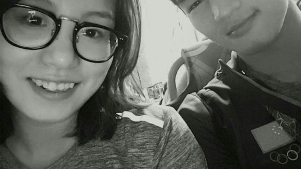 ▲9日に男子100メートル背泳ぎで銀メダルを取った徐嘉余選手と傅選手のツーショット。