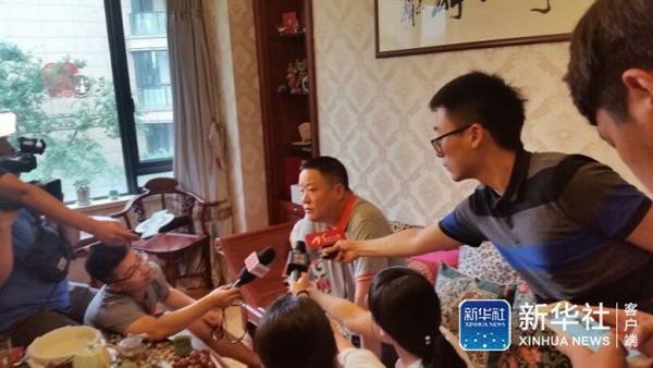 ▲取材に応える傅選手の両親。