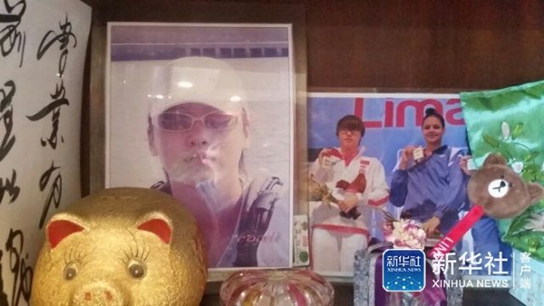 ▲「天然キャラ」の傅選手の機(jī)に置いてある寫真。サングラスをかけているのがさすが傅選手らしい。