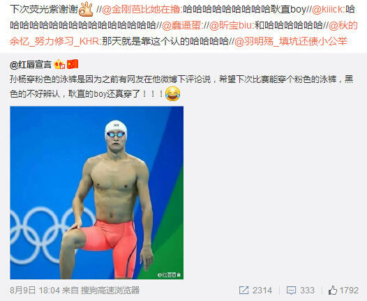 今回の五輪のレースでは、孫選手の位置が一目で分かるのに気付いていただろうか?それはあるファンが「次回の試合ではピンクの水著を著てほしい。黒だと見分けがつかないから」という書き込みがあり、その要望に応えてピンクの水著を著ていたからだ。
