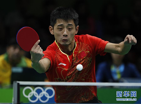 試合中の中國(guó)代表の張継科選手(8月11日撮影)