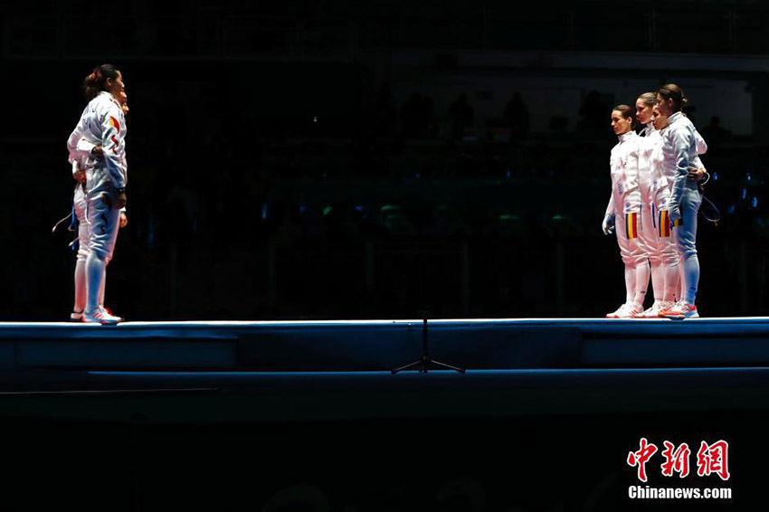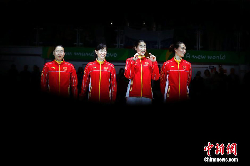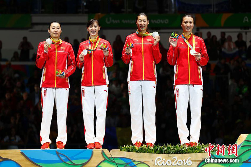 現(xiàn)地時間8月11日、2016年リオ五輪女子フェンシングのエペ団體戦で孫一文、孫玉潔、許安琪、■佳露(■は赤におおざと)からなる中國チームが38対44でライバルのルーマニアに敗れ、銀メダルを獲得した。寫真は表彰臺に上がる中國チーム。中國新聞網(wǎng)が伝えた。(編集JK)
