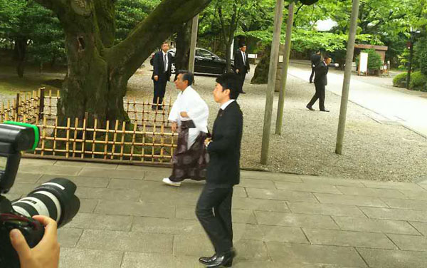 自民黨の農(nóng)林部會長の小泉進(jìn)次郎氏が靖國神社へ向かっている。