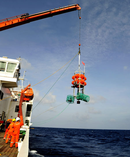 有人深海科學(xué)調(diào)査母船「張謇號(hào)」は17日、ニューブリテン海溝の水深6700メートル以上の作業(yè)エリアで、1萬(wàn)メートル級(jí)有人深海潛水艇「彩虹魚」を投入し、海洋環(huán)境調(diào)査を行った。寫真は當(dāng)日、著陸機(jī)を投入する「彩虹魚」プロジェクトのメンバー。中國(guó)青年網(wǎng)が伝えた。(編集YF)